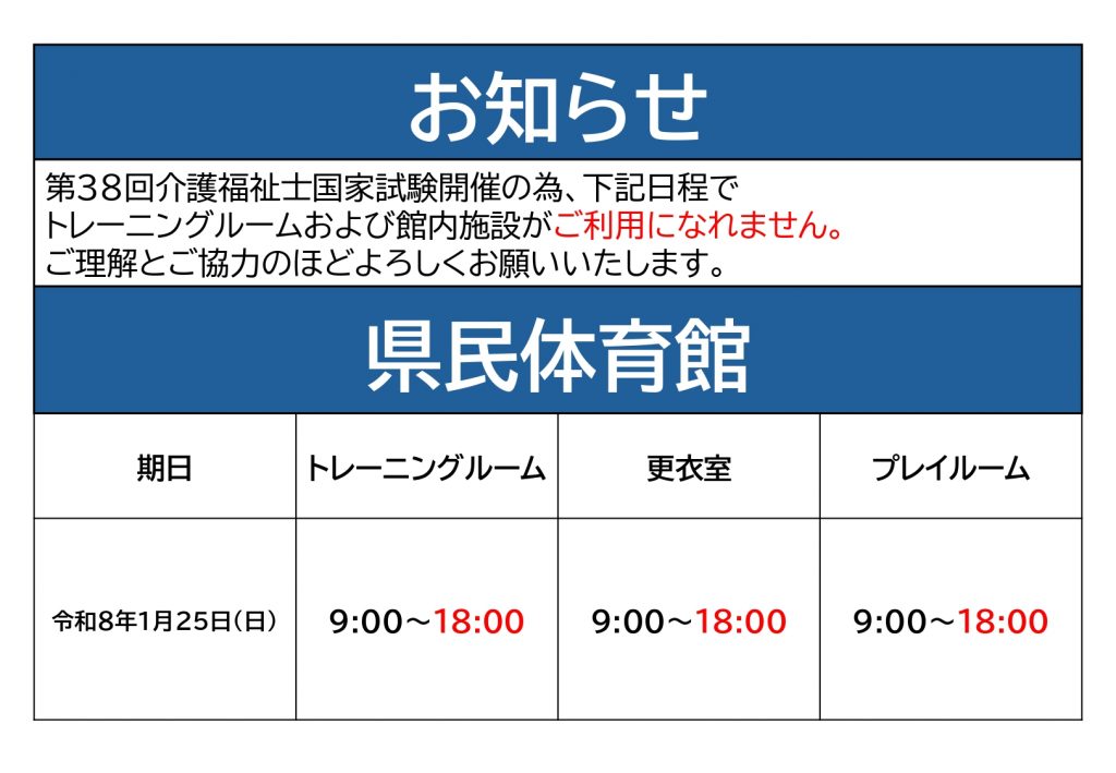 【令和8年1月25日】「第38回介護福祉士国家試験」開催に伴うトレーニングルーム等の利用制限について