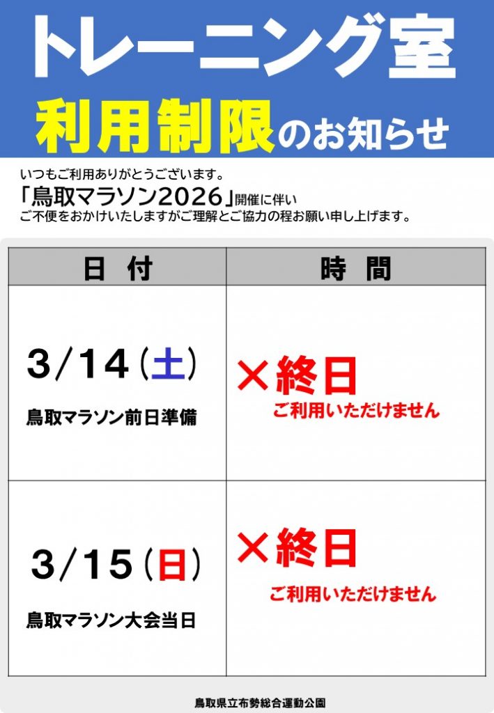 3月14日(土)から3月15日(日)は、陸上競技場トレーニングルームの利用制限があります。