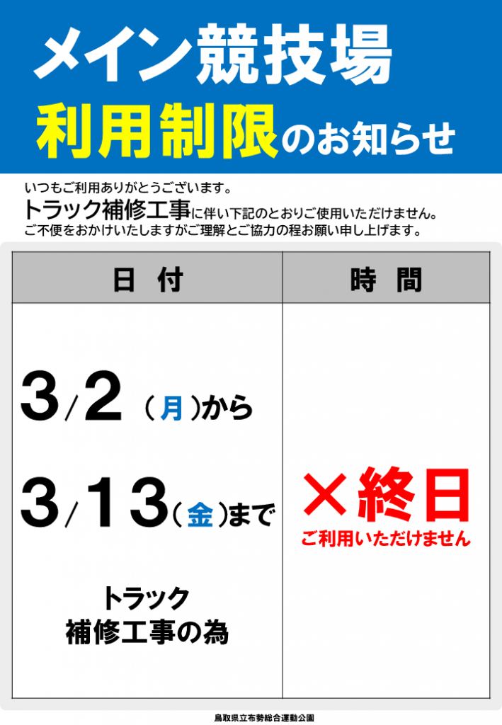 3月2日(月)~3月13日(金)トラック補修工事に伴う利用制限について