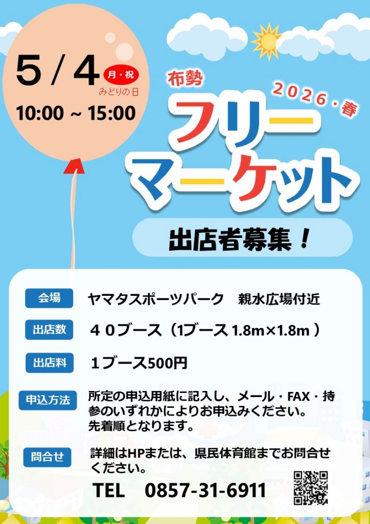 2026年4月6日 5月4日(月・祝)「布勢フリーマーケット2026・春」出店者の募集について 詳しくは下記イベントページをご覧ください。 https://www.fuse-sportspark.com/guidance-of-event/ 鳥取県立布勢総合運動公園