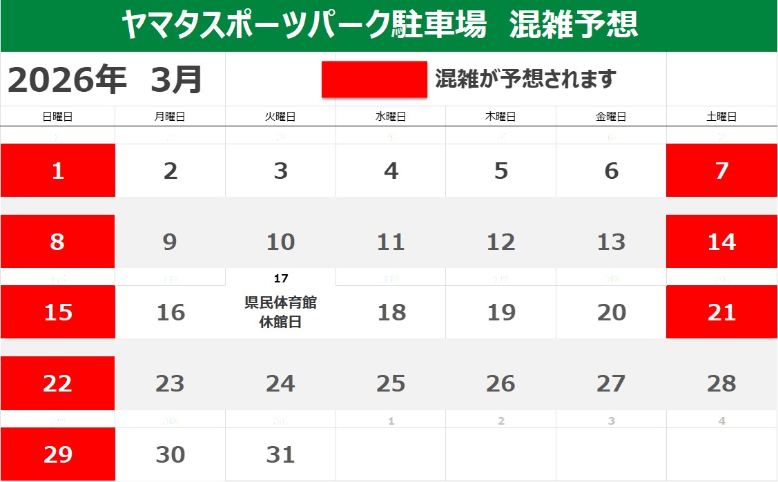 2026年2月4日 駐車場混雑予想 2月分、3月分について 日頃よりヤマタスポーツパークをご利用いただきありがとうございます。大会・イベント等での駐車場の混雑が予想される日程を掲載いたします。※第3火曜日の休館日は、県民体育館のみ。 鳥取県立布勢総合運動公園