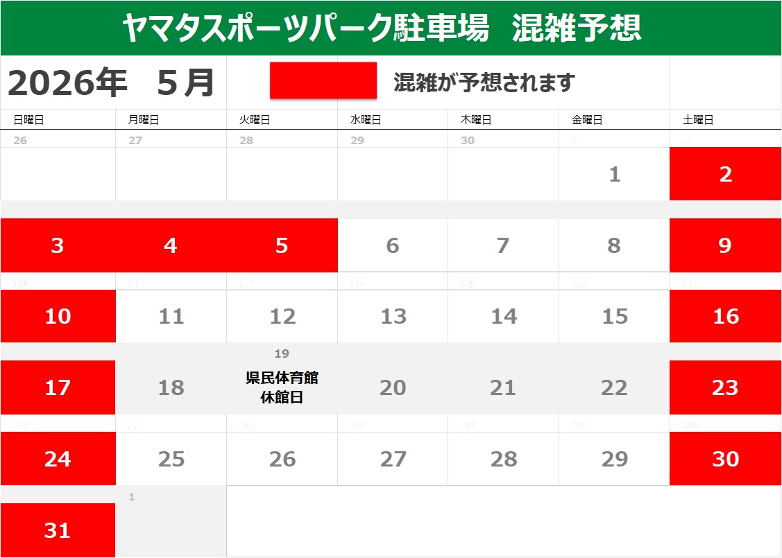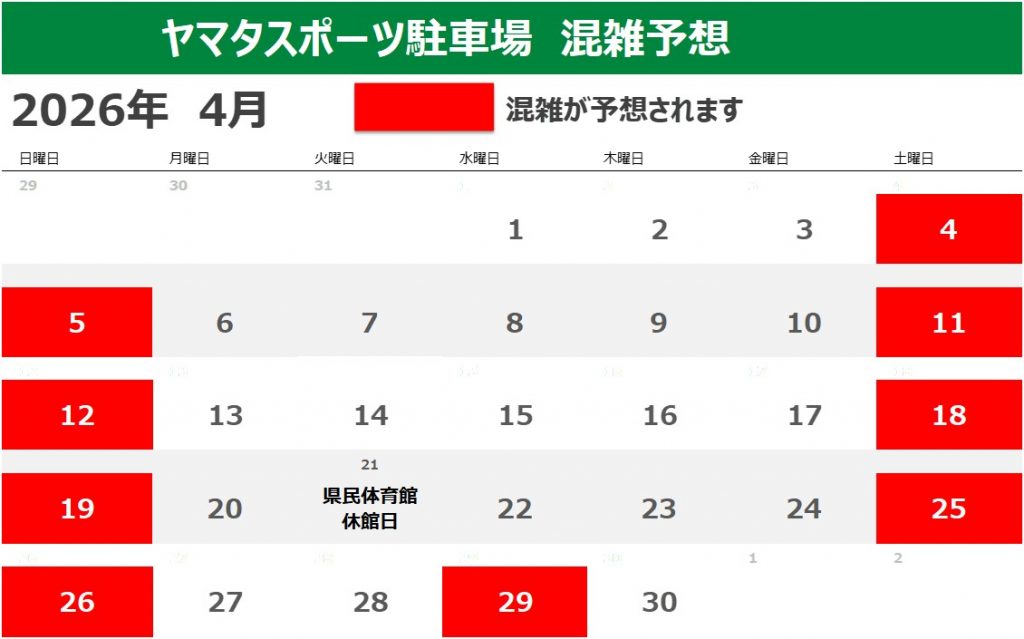 2026年4月1日 駐車場混雑予想 4月分、5月分について 日頃よりヤマタスポーツパークをご利用いただきありがとうございます。大会・イベント等での駐車場の混雑が予想される日程を掲載いたします。※第3火曜日の休館日は、県民体育館のみ。 鳥取県立布勢総合運動公園